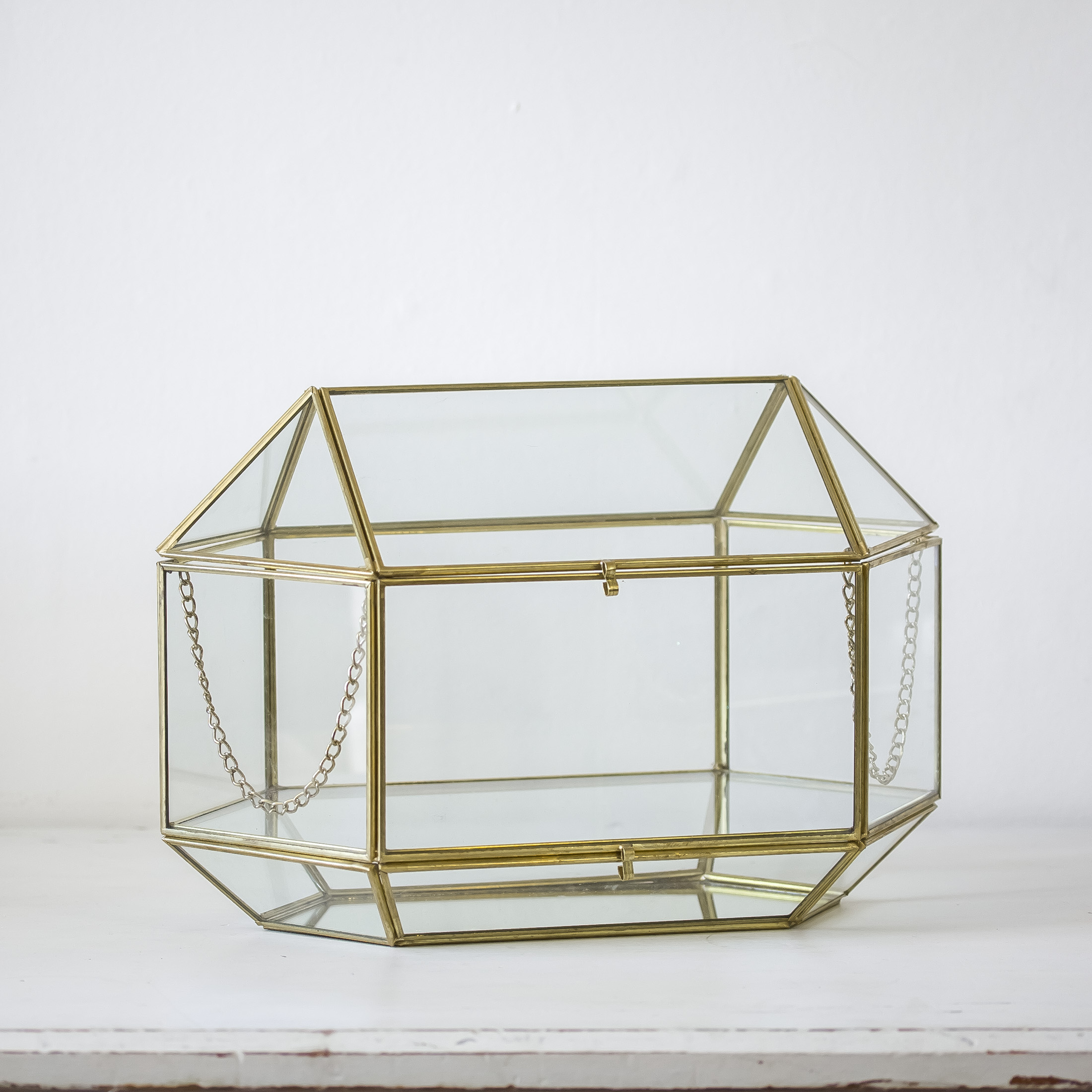 Collect your guests' cards in this sleek glass card box, trimmed in gold or rose gold iron.