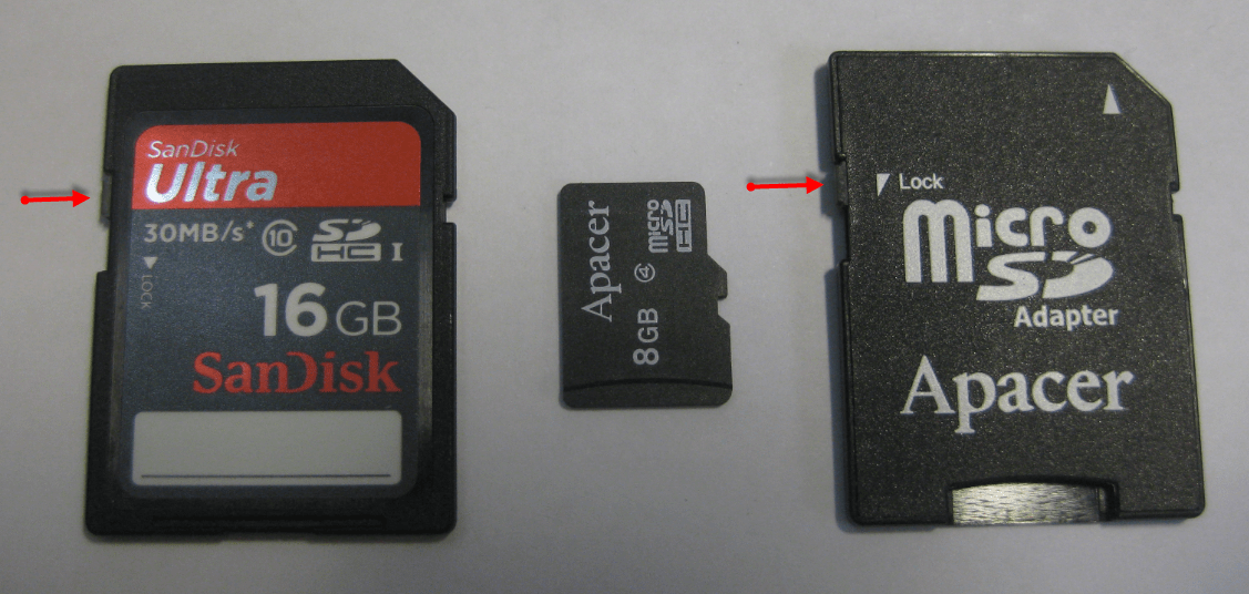 For sd/sdhc memory cards, there is a lock switch on the left side of the sd card.